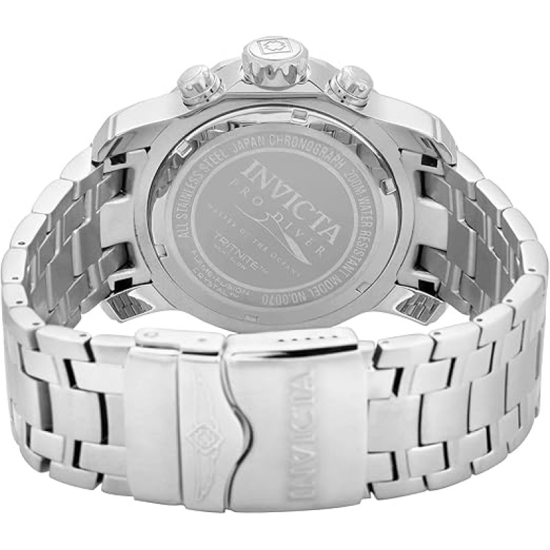 With the affordable silver-tone Invicta Pro Diver SQ quartz men's watch, you can still afford to buy flippers and a pair of goggles. It features a shock-resistant, Japanese quartz movement that will stand up to the rigors of your undersea adventures, and it's water resistant to 200 meters (660 feet). It's topped by a blue-plated unidirectional rotating bezel with elapsed time markings in silver and scalloped edges for a firm grip even with diving gloves. The blue dial includes large Tritnite luminous markers and hands (with seconds hand) and a date window at 3 o'clock with a magnifier. Other features include a fold-over clasp with safety and an anti-reflective mineral crystal.